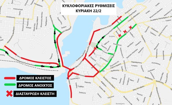 - Οδός Λιάσκα, Παπαστρατή και Μακαρίου: Απαγορεύεται η κίνηση παντός είδους οχήματος στο τμήμα από την παλιά γέφυρα μέχρι τη συμβολή με την οδό Αριστοτέλους.
